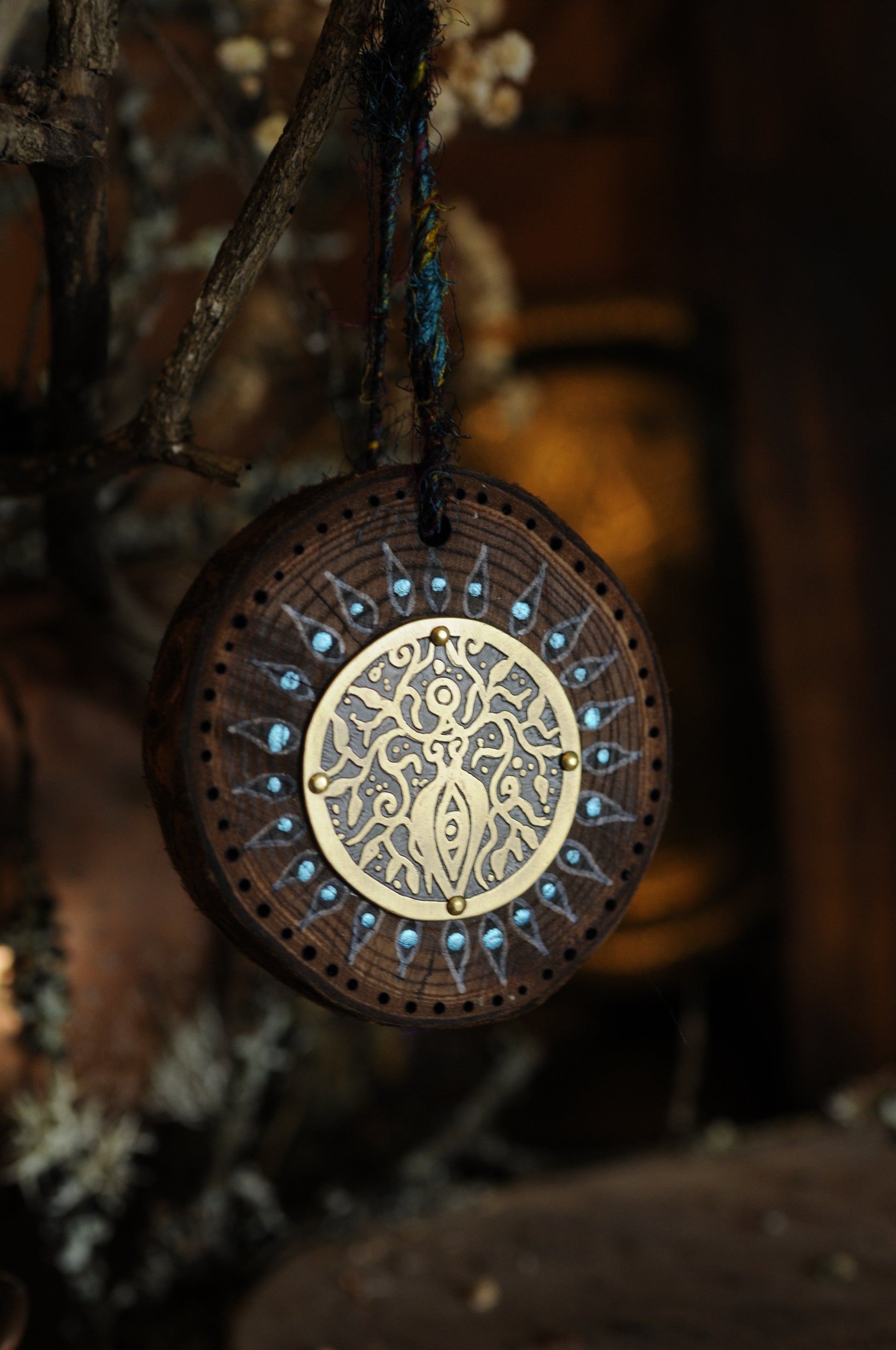 Pièce unique entièrement faite à la main. Tranche de bois pyrogravée et peinte sur laquelle est cloué un médaillon unique en laiton gravé.