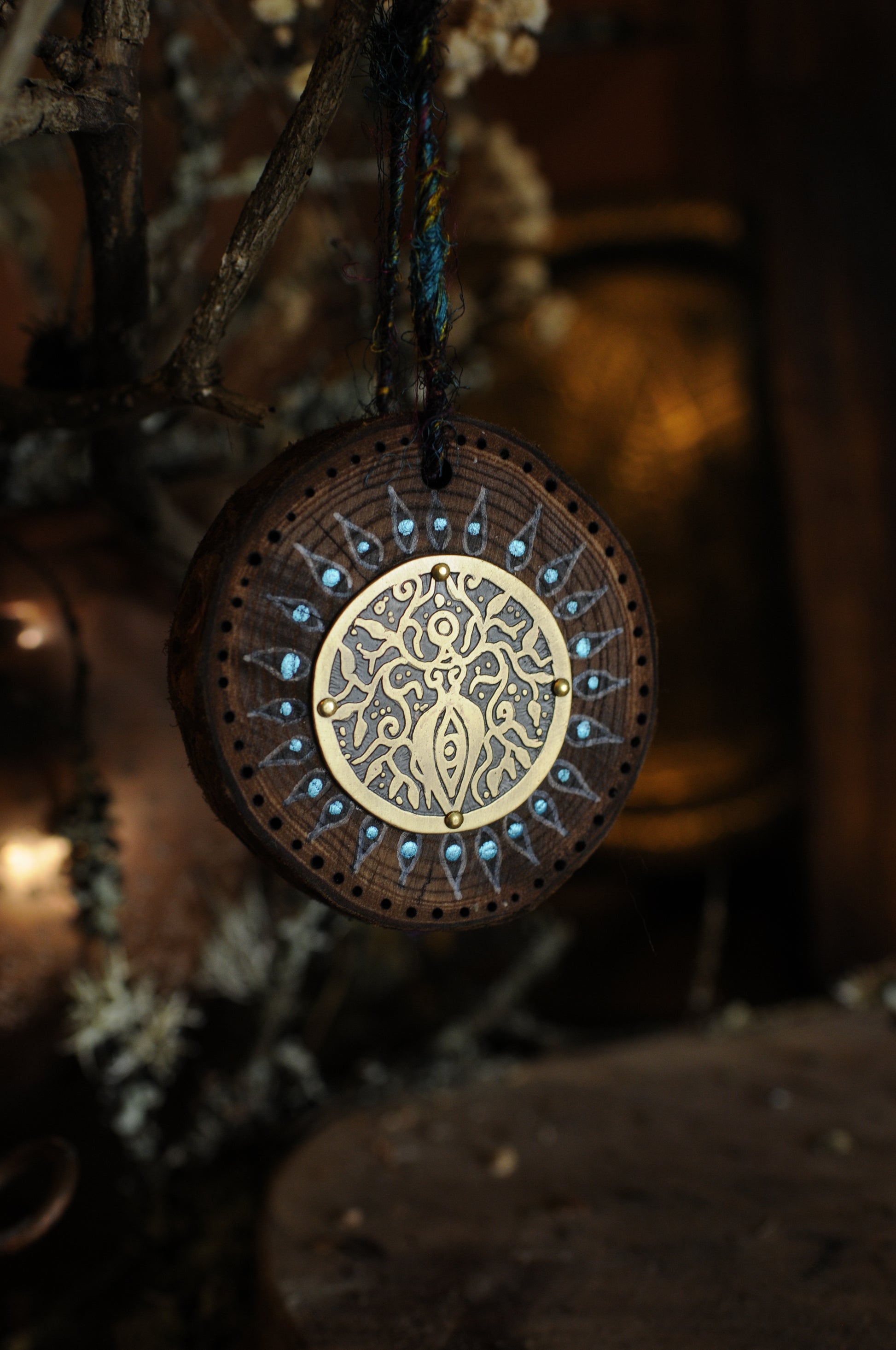Amulette de maison, bois peint et pyrogravé et médaillon en laiton gravé