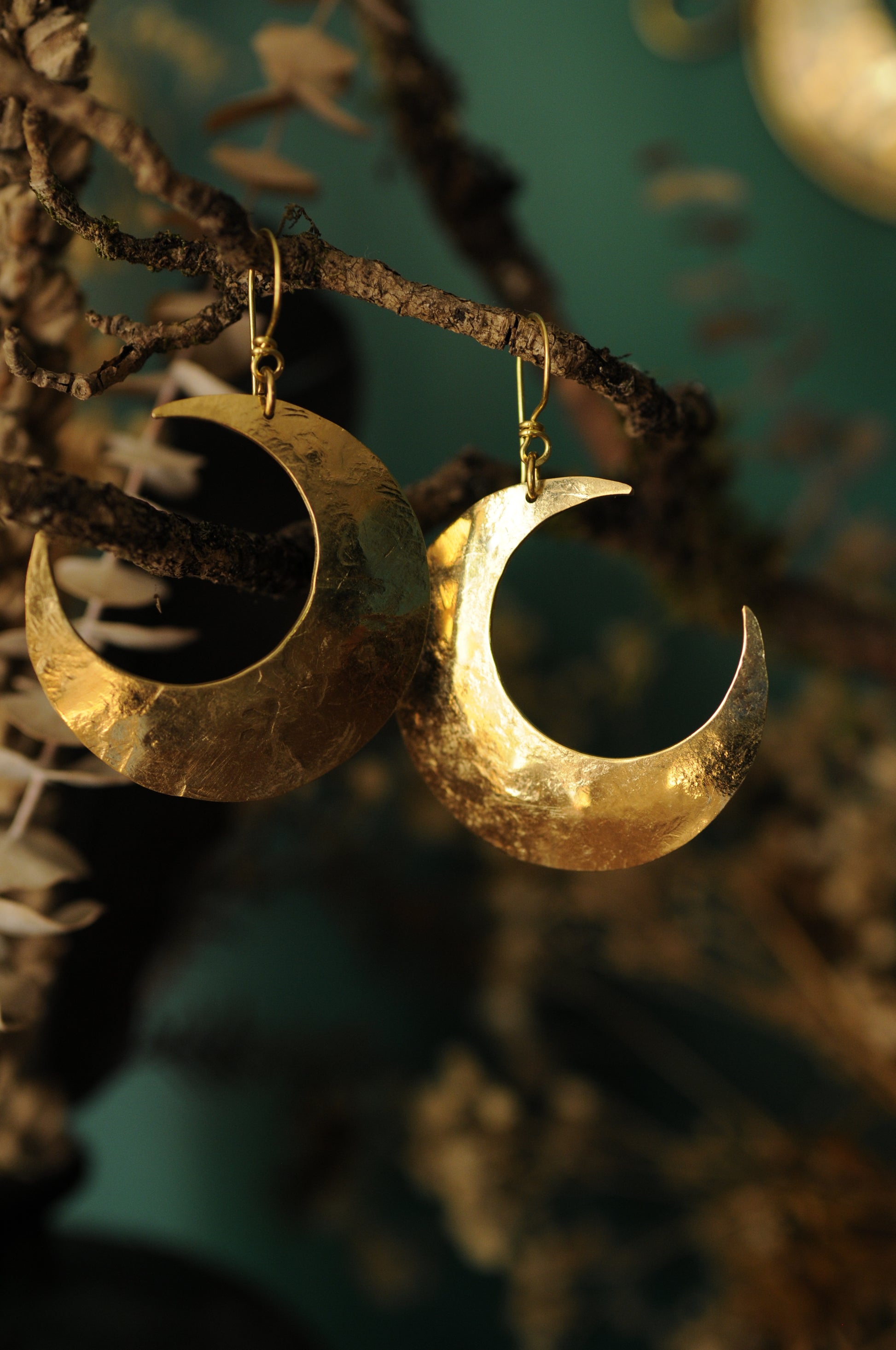 Boucles d'oreilles grand croissant de lune martelé en laiton