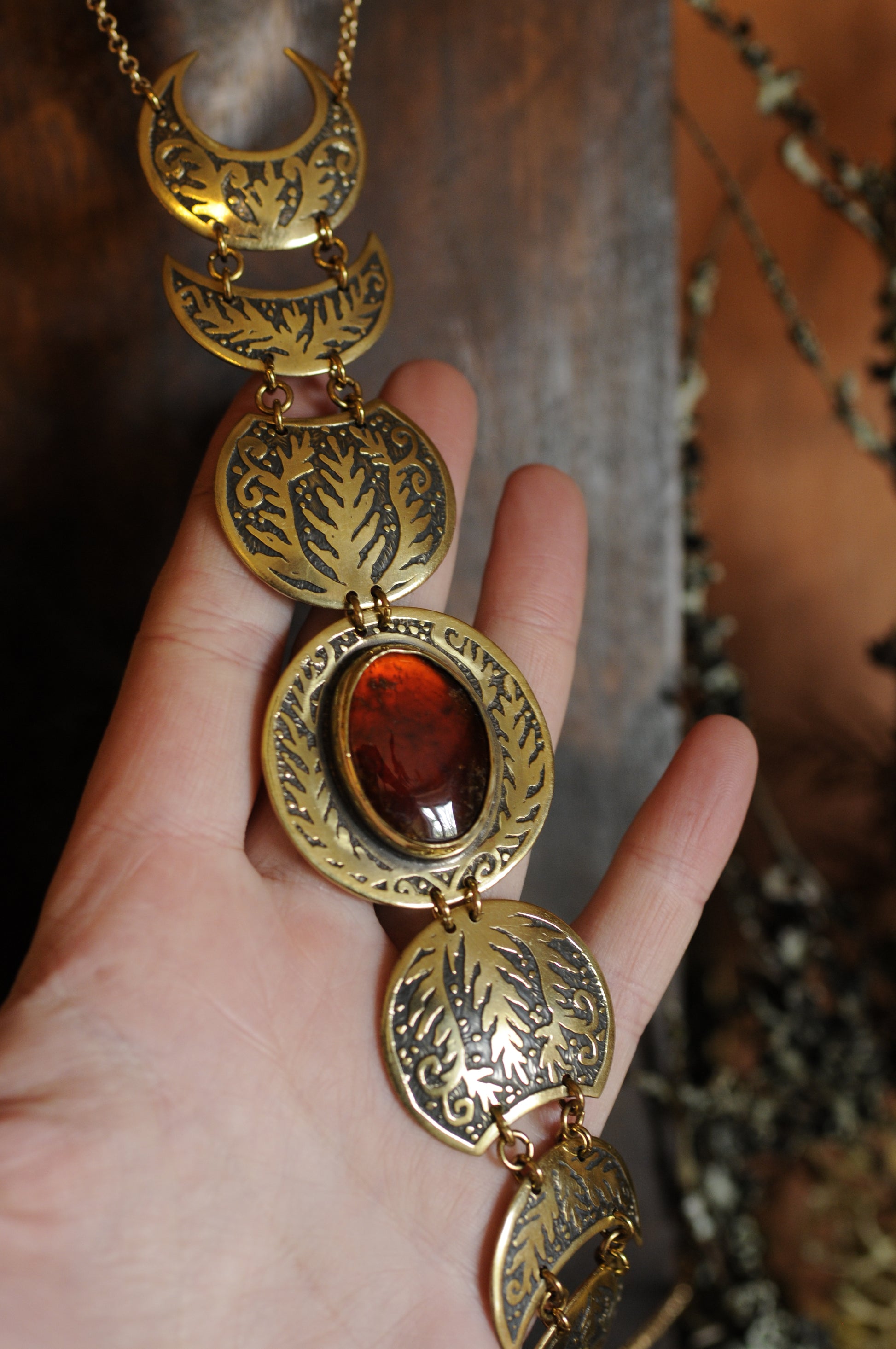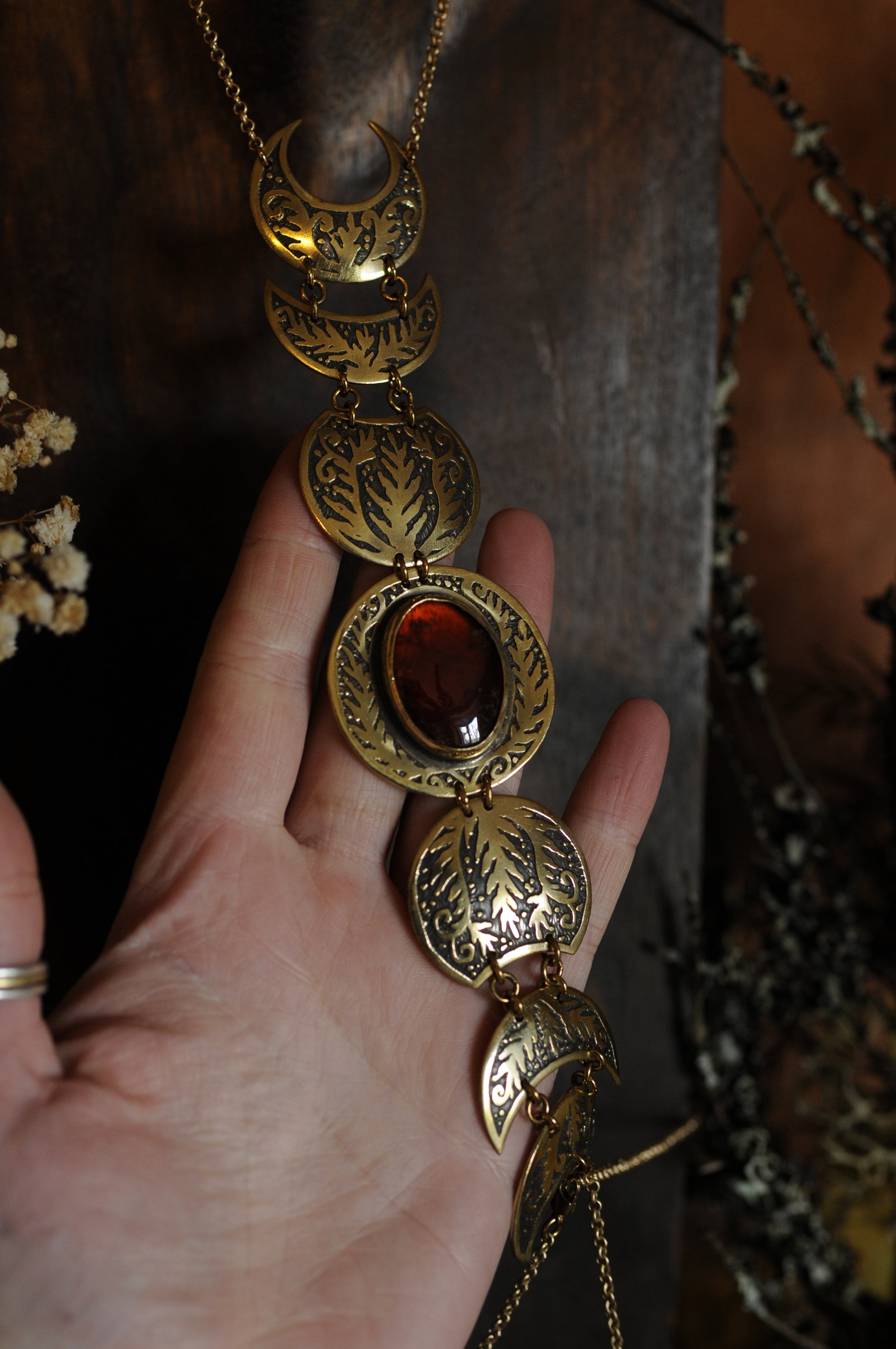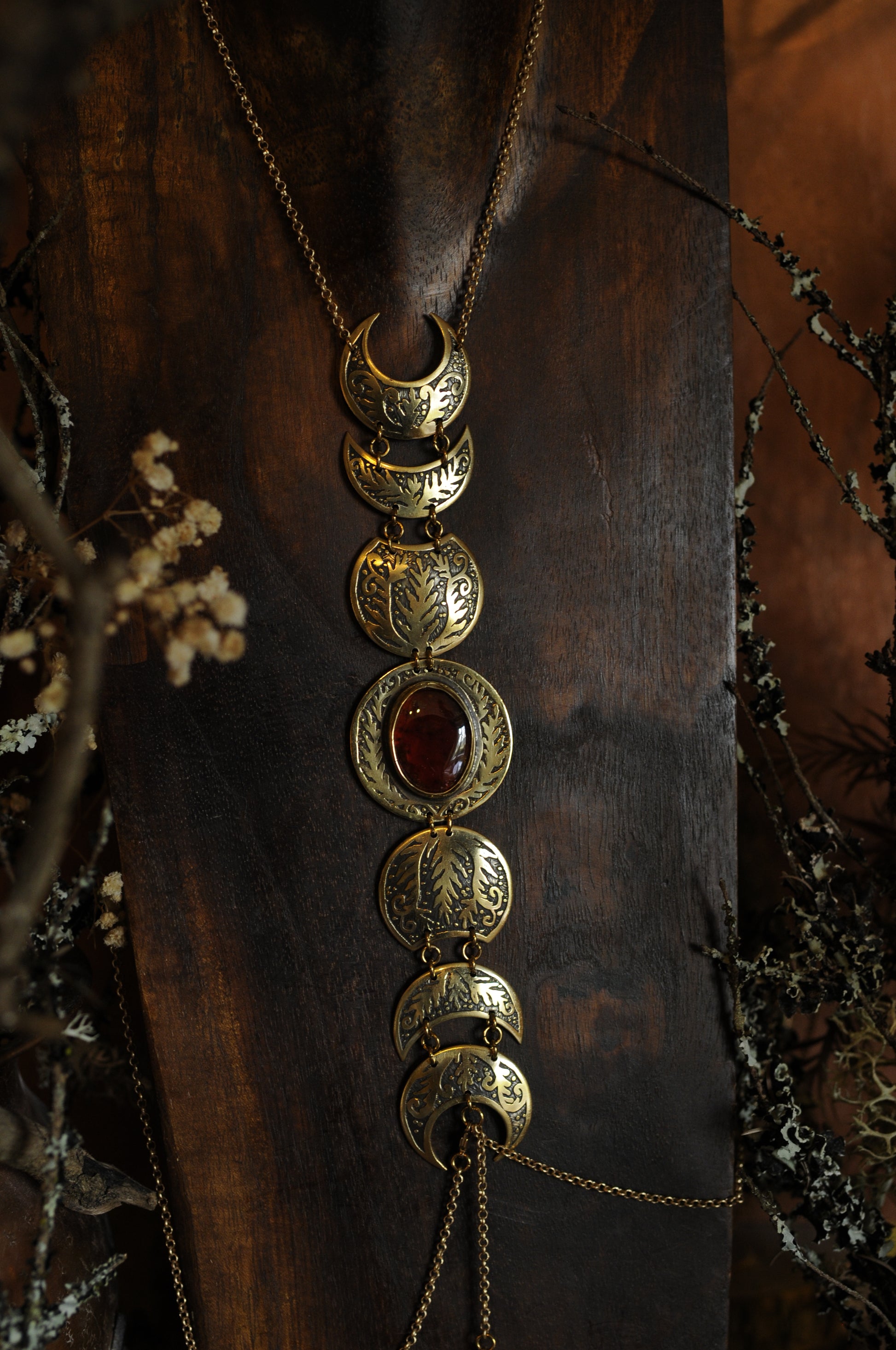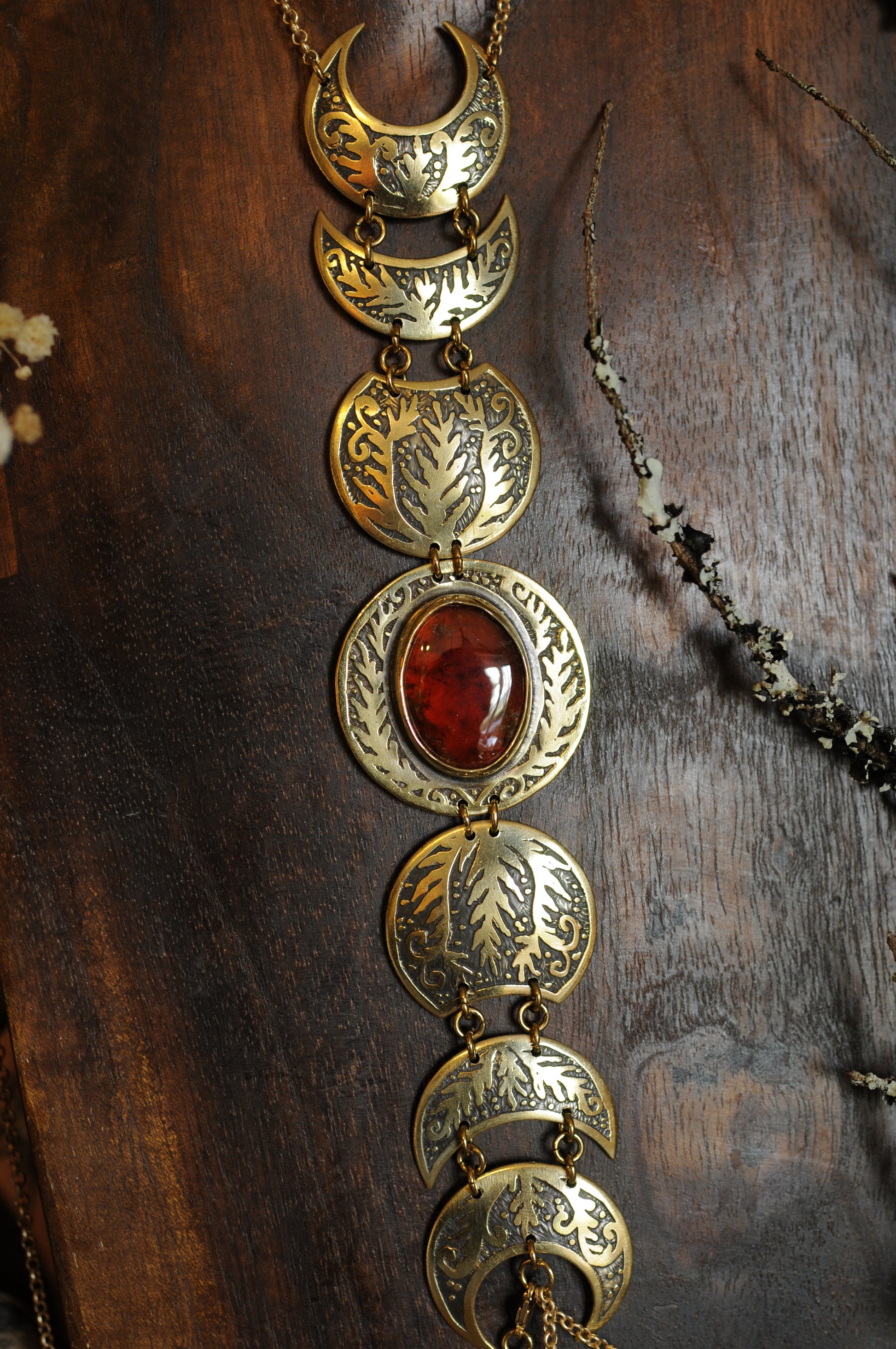 Grand bijou de corps Cycle lunaire en laiton gravé avec grenat orangé