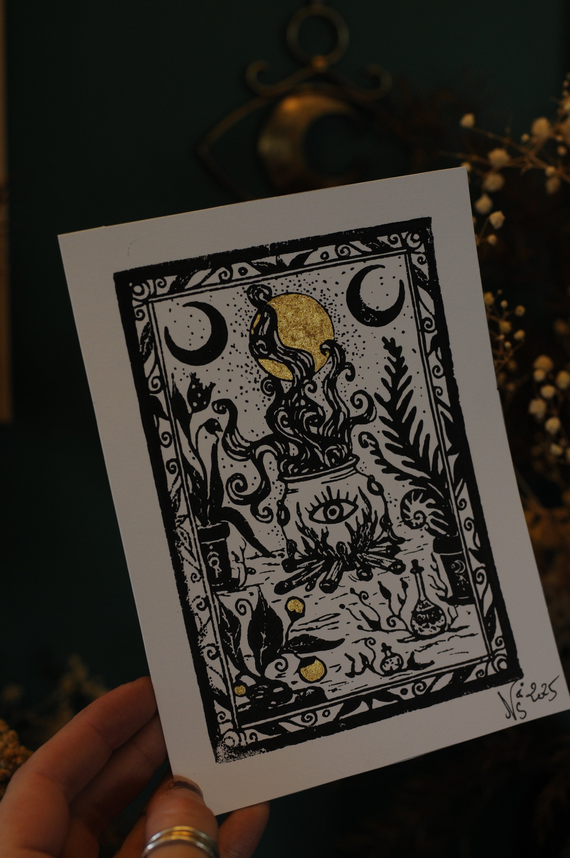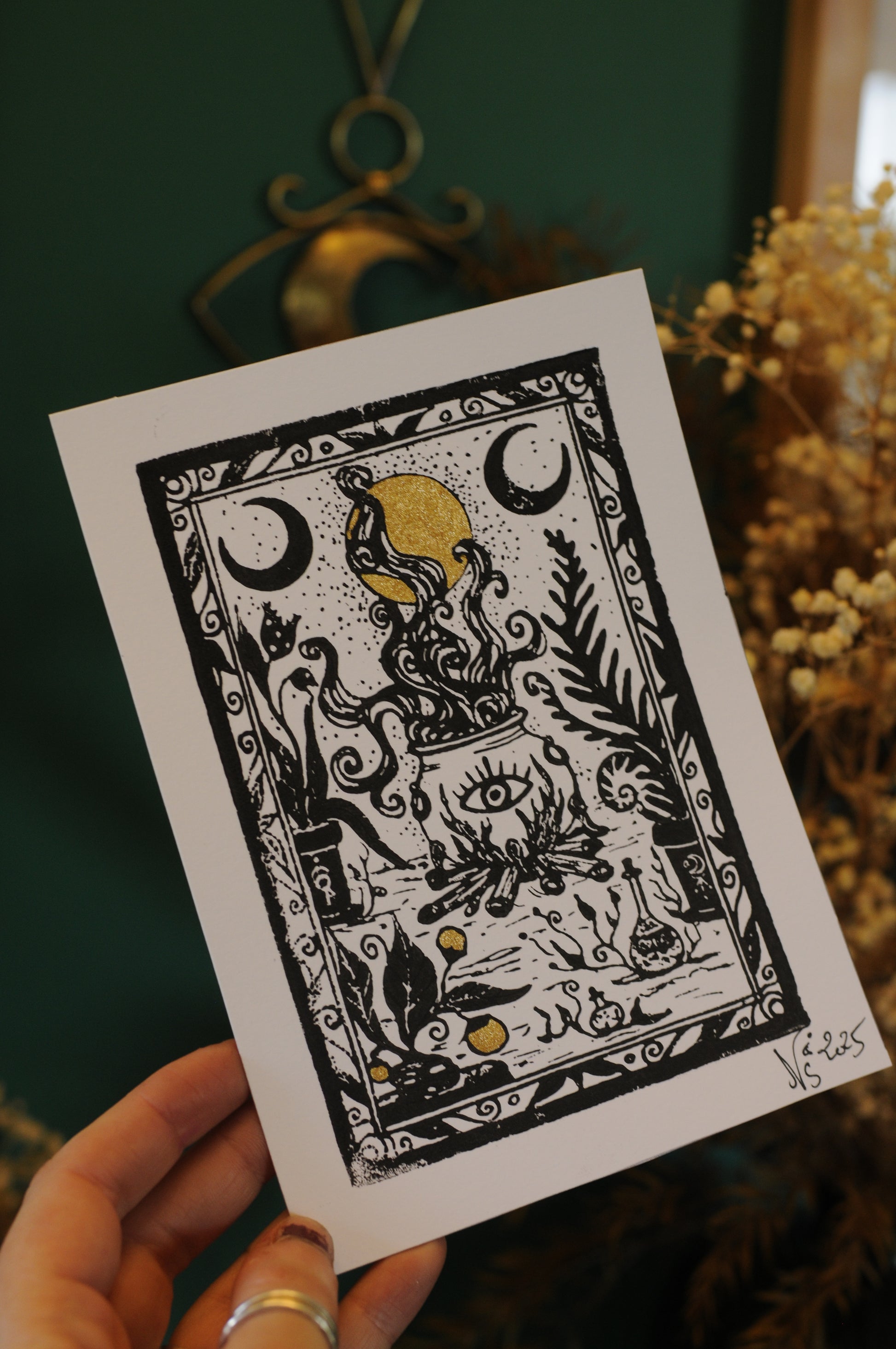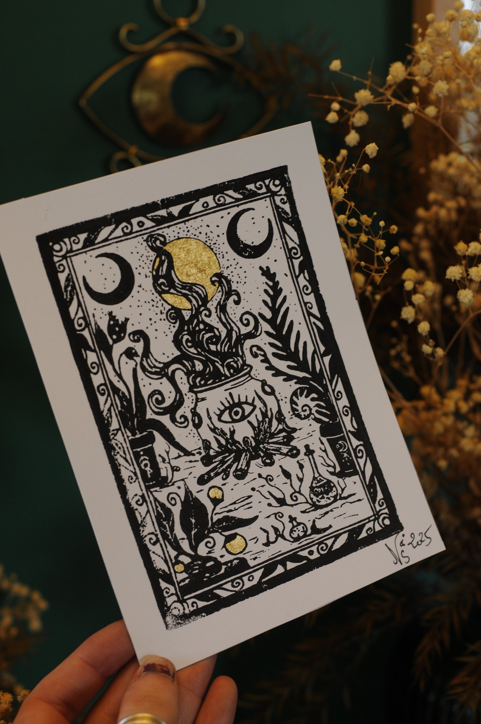 Tirage sur papier de gravure en laiton ( comme une linogravure ), chaque tirage est unique et peu présenter des différences avec ceux en photo. Petites touches de peinture doré