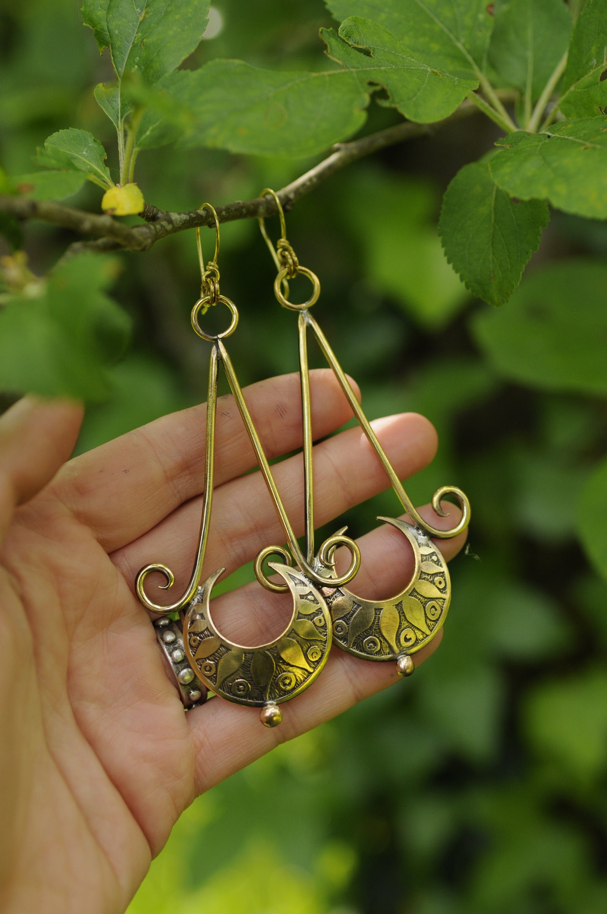 Longue boucles d'oreilles Lune égyptienne en laiton gravé et bille de bronze