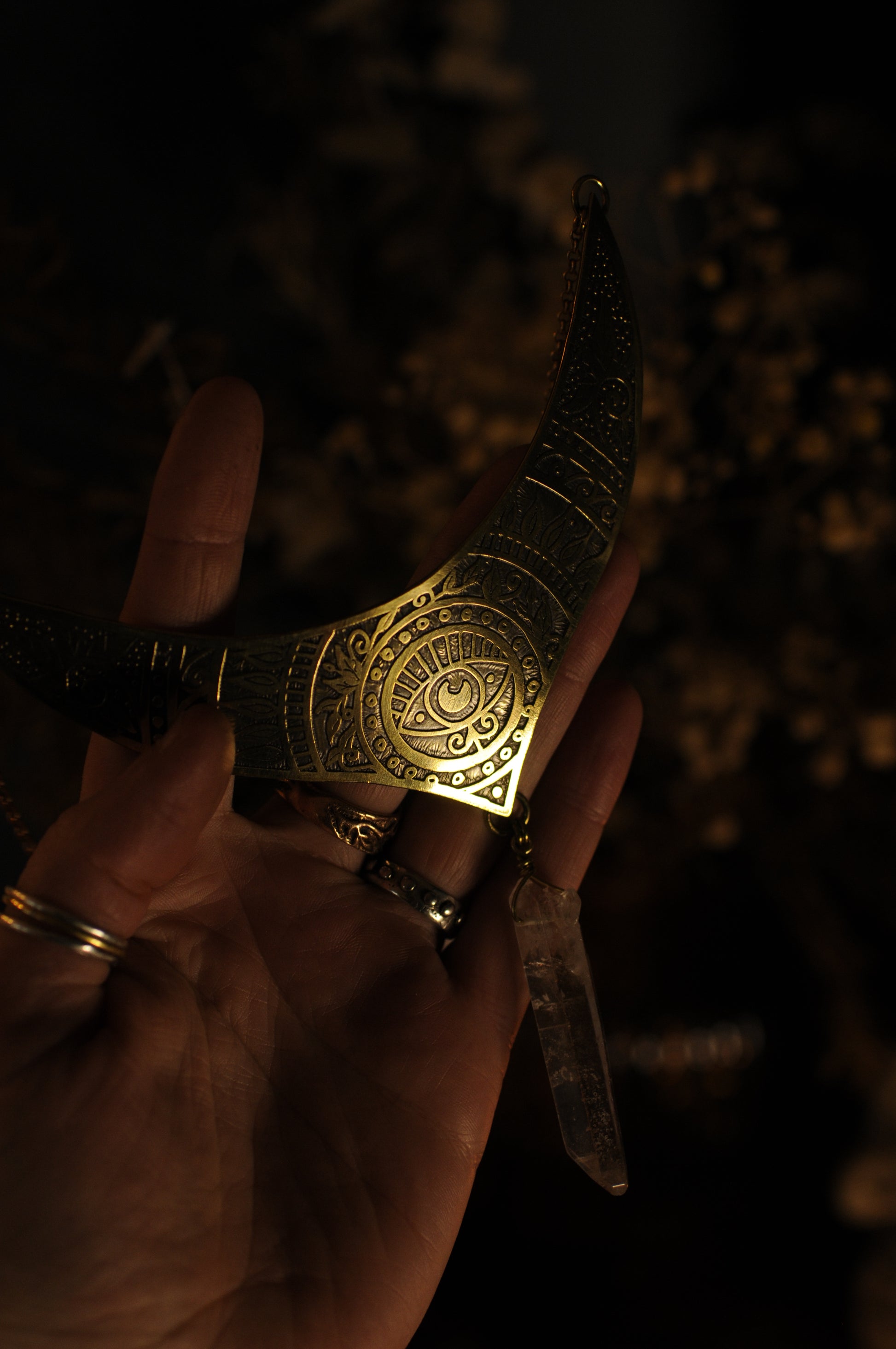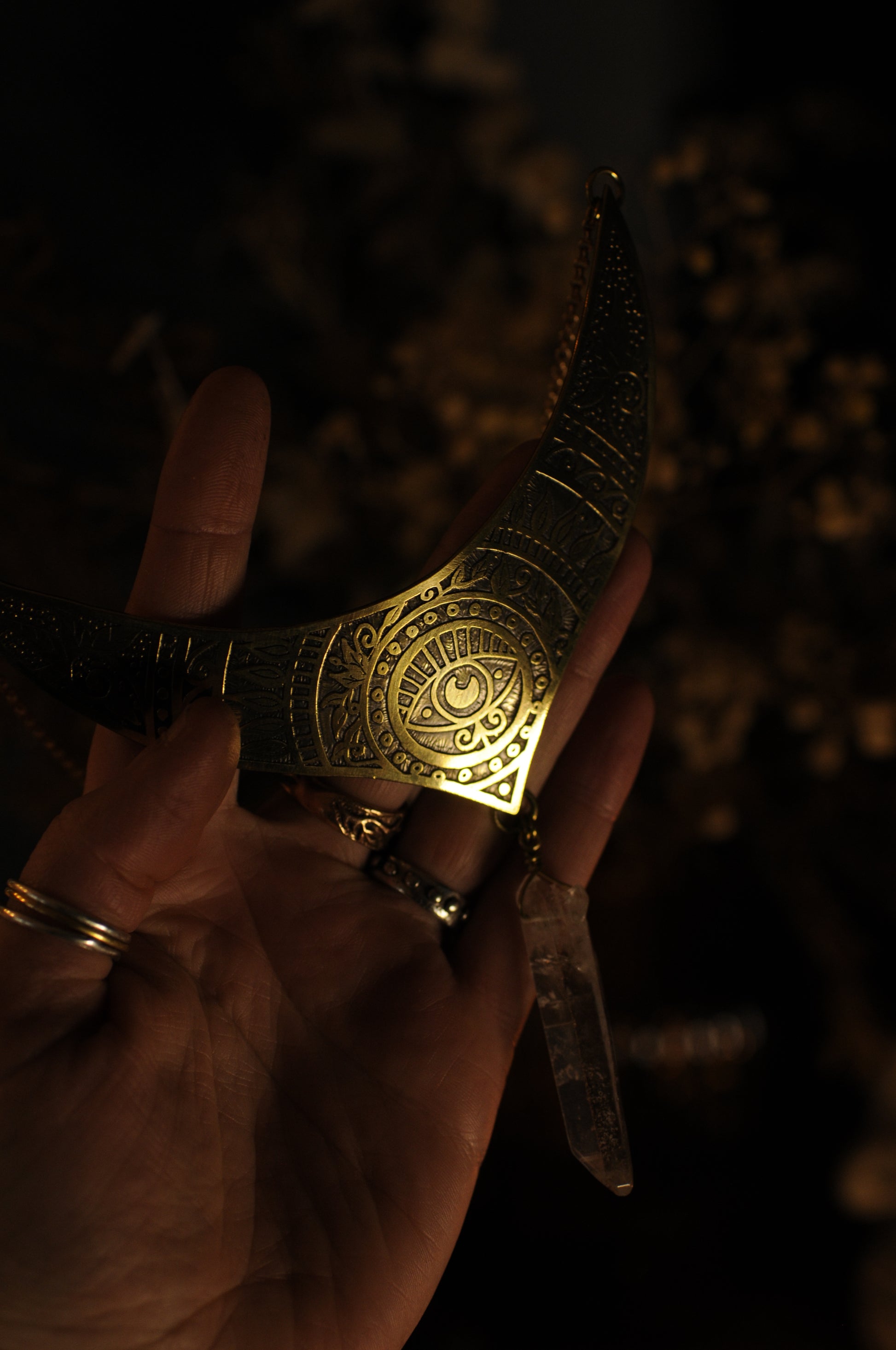 Petit plastron en laiton gravé et pointe de quartz, Oeil veilleur