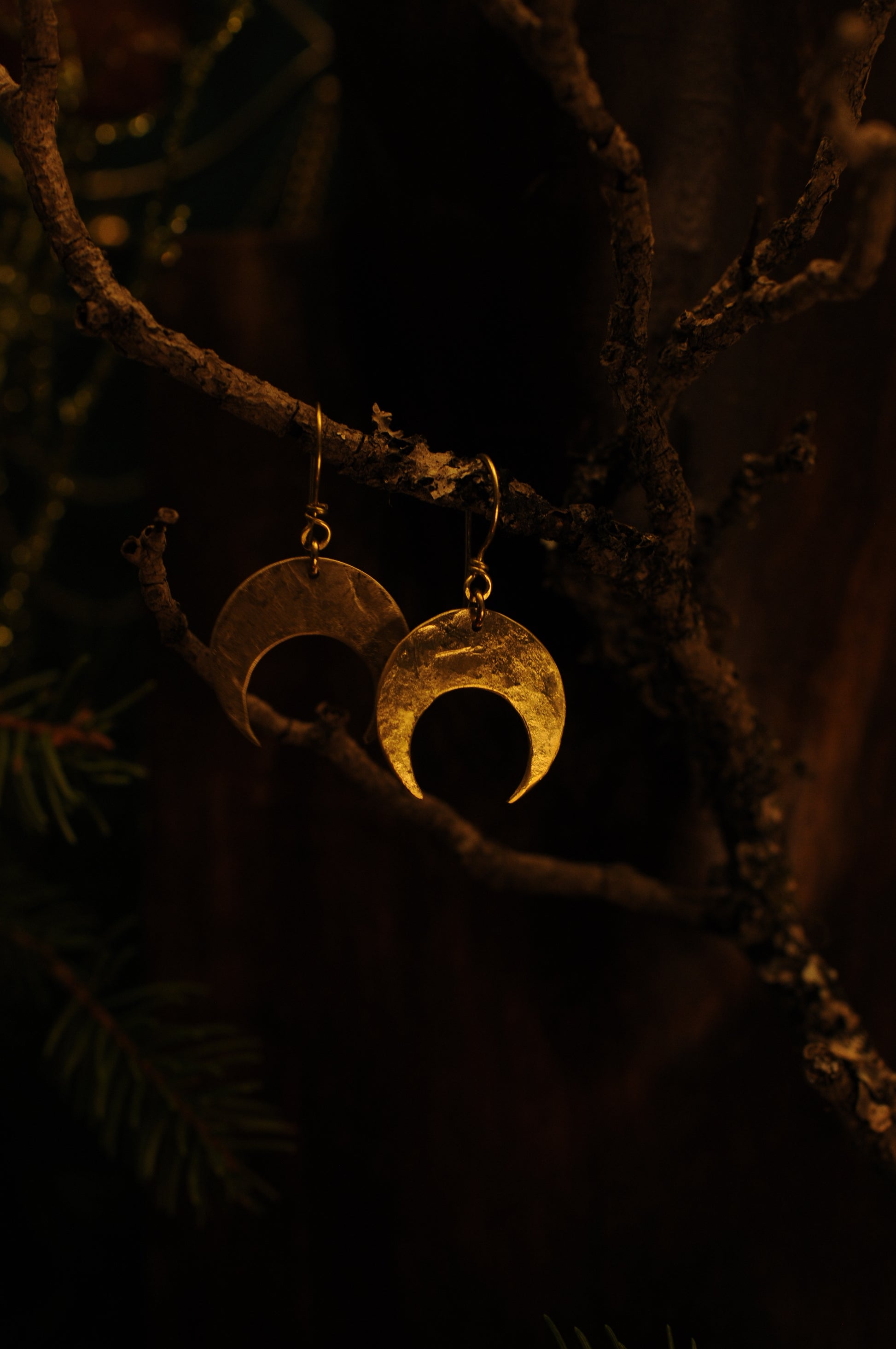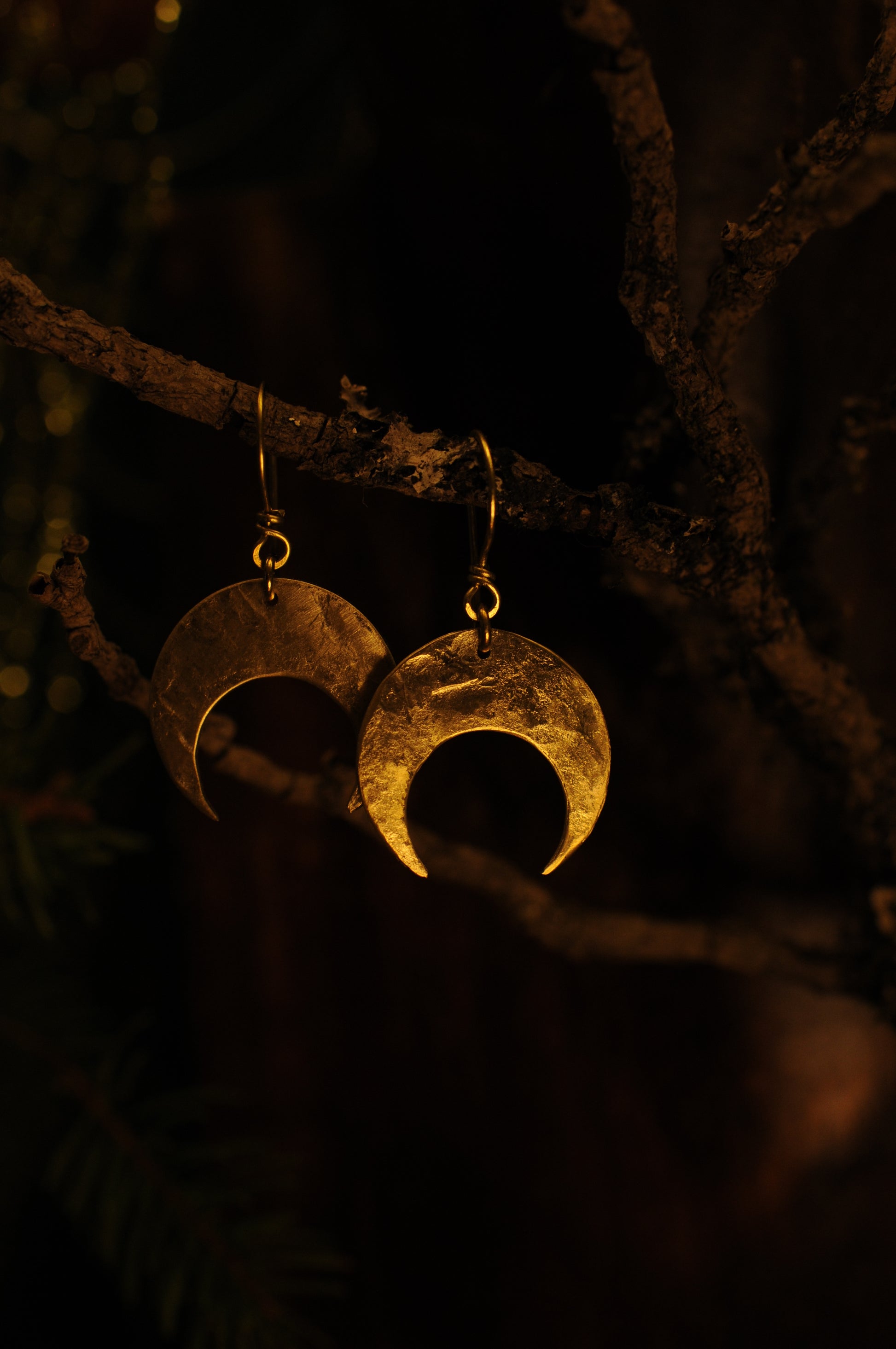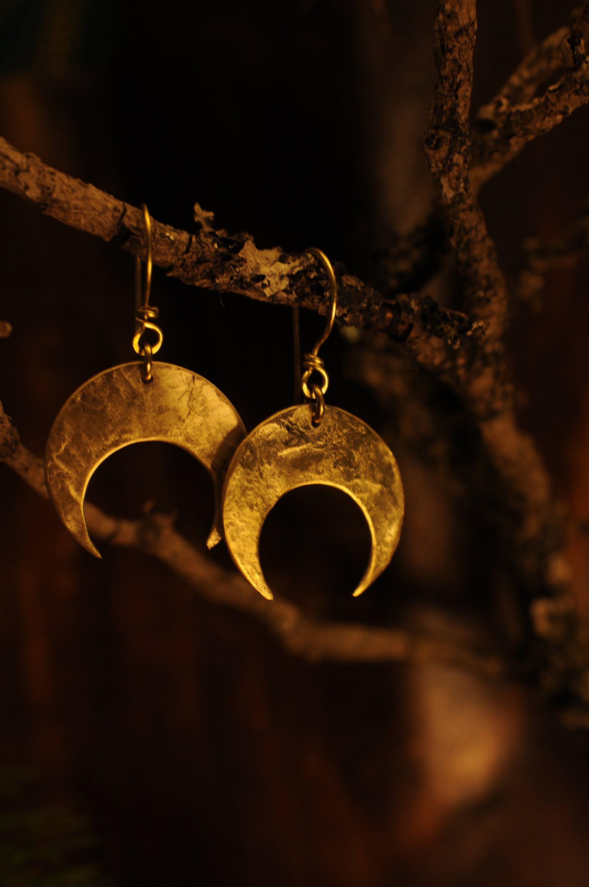 Petites boucles d'oreille croissant de lune en laiton martelé.
