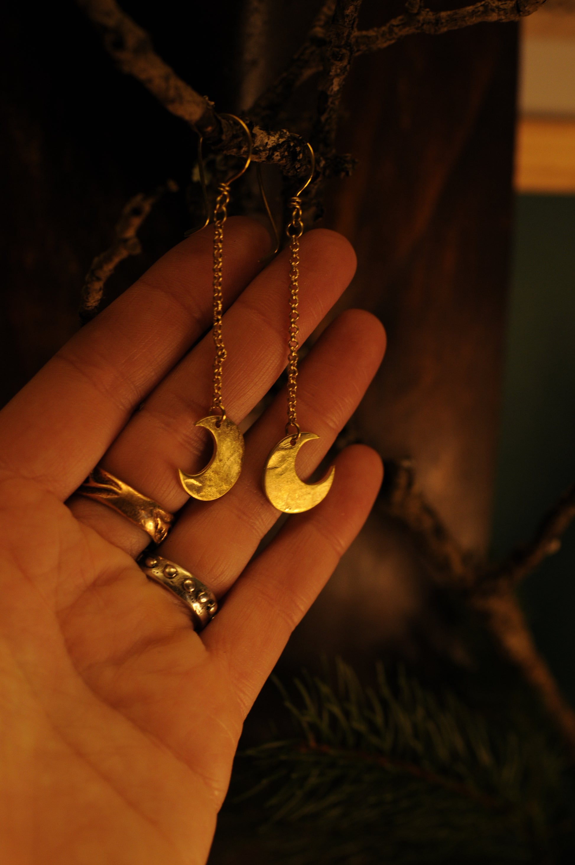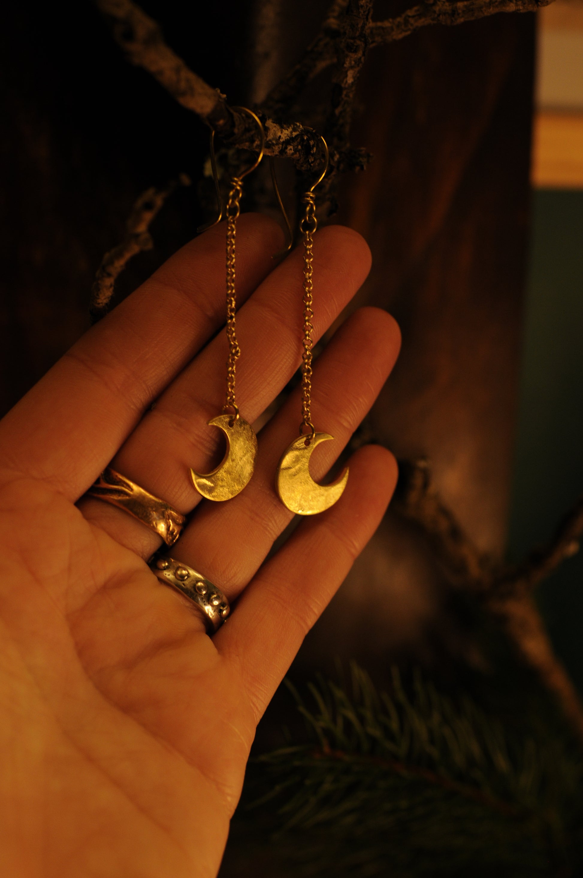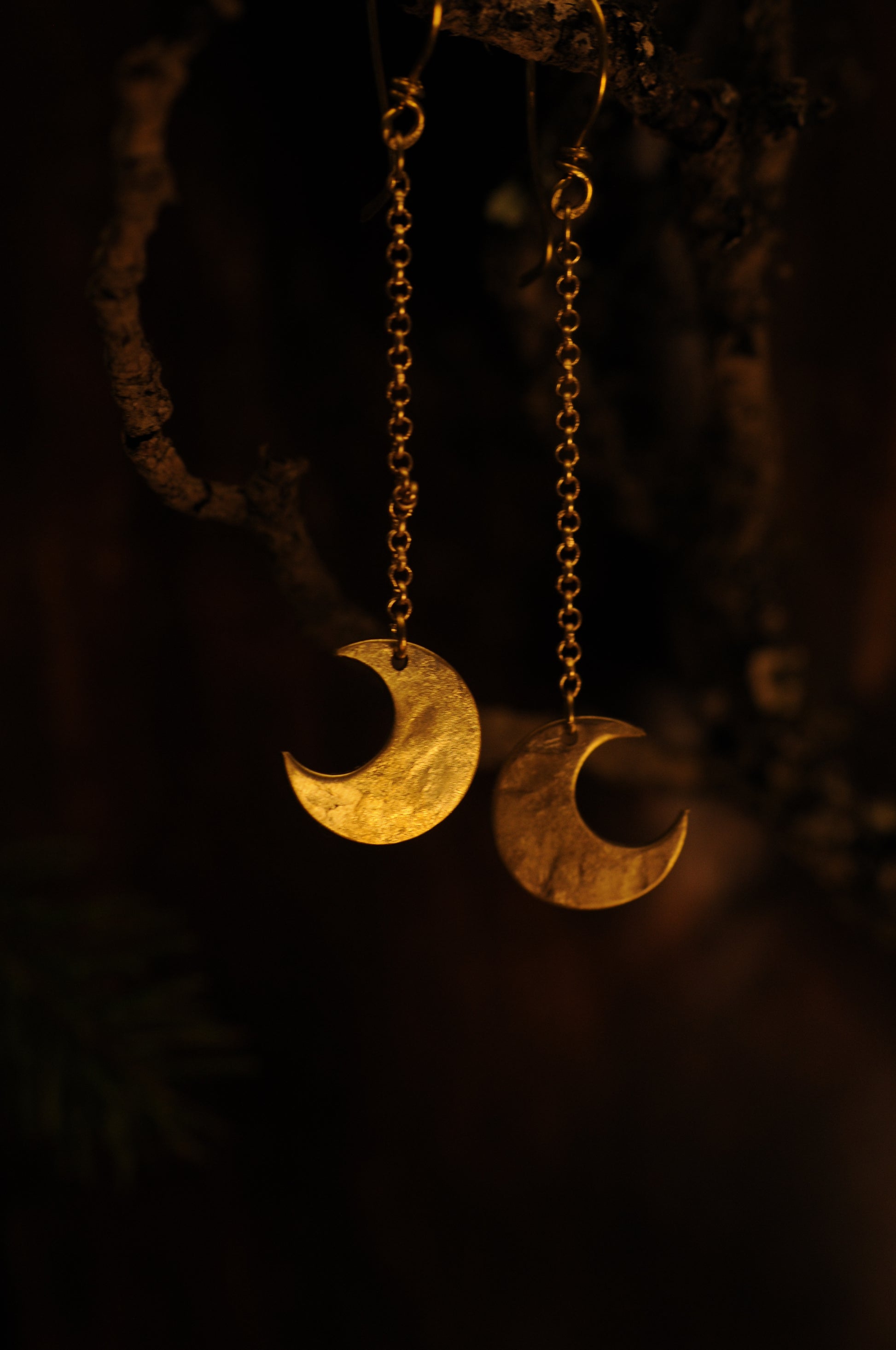 Petites boucles d'oreilles Lunes filantes en laiton martelé.